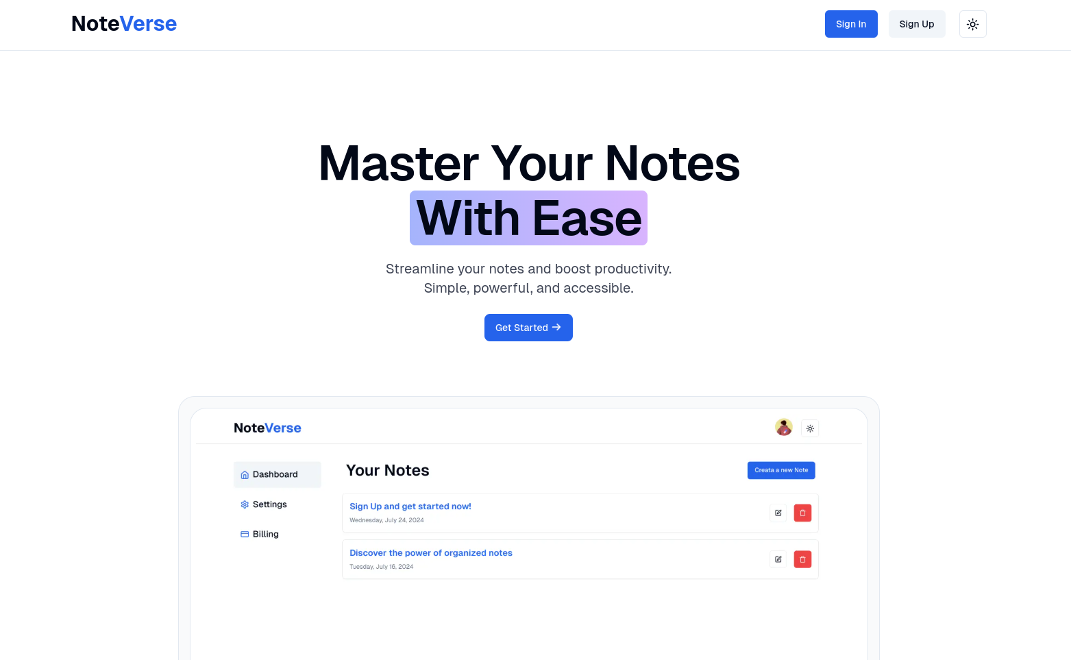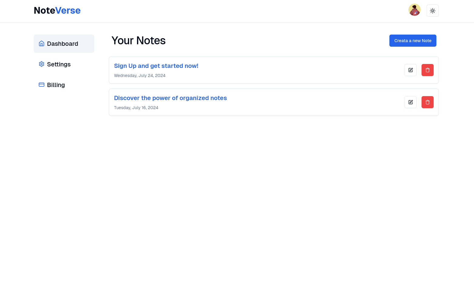 NoteVerse is a feature-rich note-taking SaaS application that simplifies the way you capture, organize, and access your ideas. Built with cutting-edge technologies, it empowers users to stay productive with seamless note creation, editing, and management.